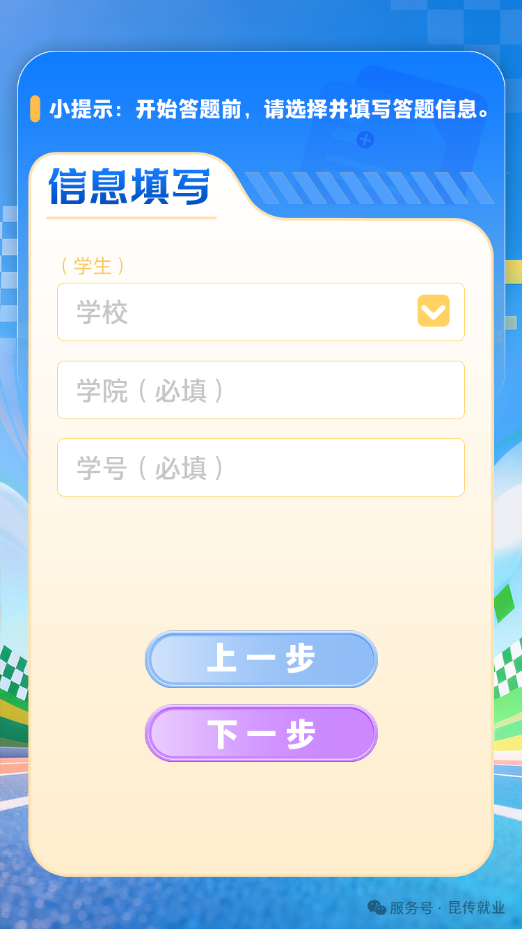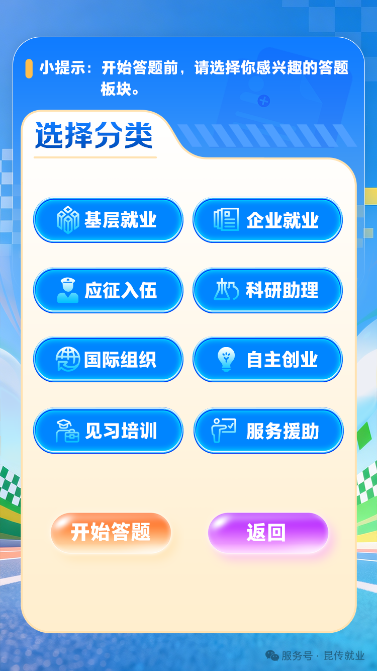 本次活动以线上学习+有奖答题的形式开展,围绕基层就业、企业就业等内容将《云南省促进高校毕业生就业创业政策100问》分为8个学习和答题板块。参与答题前,需先选择和填写答题信息及答题板块,随后进入答题页面,由系统随机分配8道题,答对5题进入抽奖环节,即可参与抽奖,有机会获得奖励。
